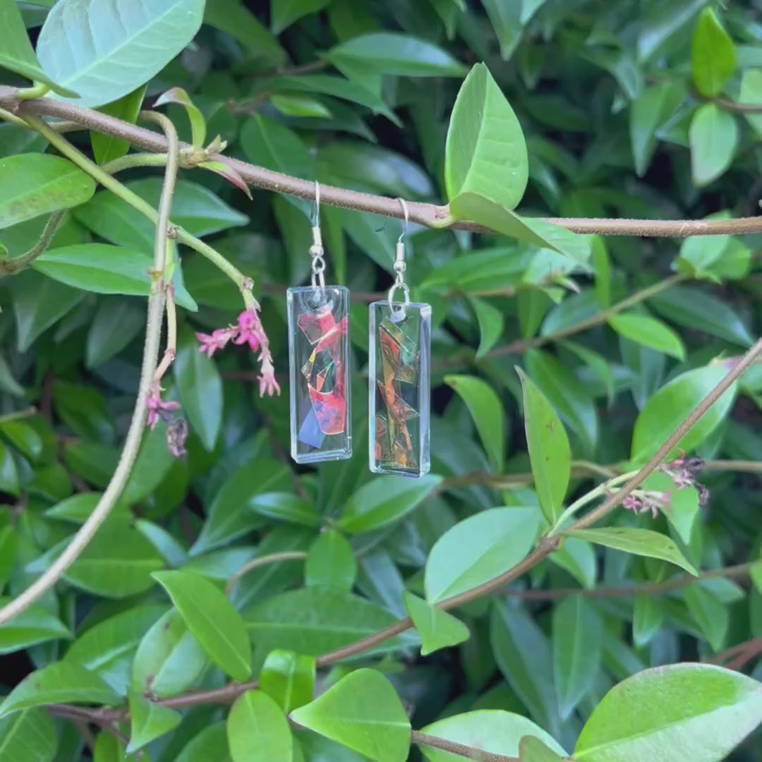 Make a bold statement with these eye-catching rectangular resin earrings featuring vibrant holographic abstract art. Each pair showcases unique colorful light encased in crystal-clear resin that catches the light beautifully. Lightweight and comfortable for all-day wear.